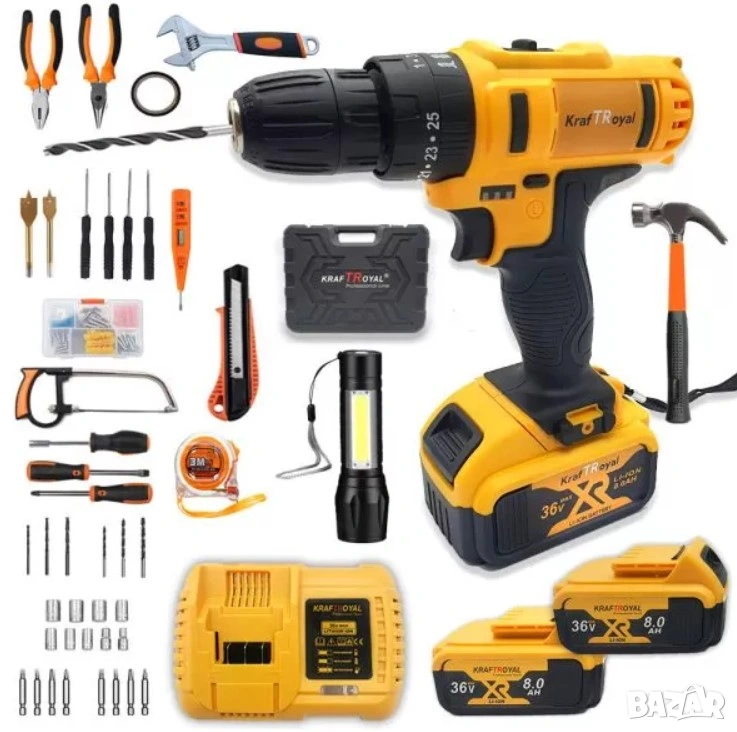 Изключително качествен здрав и мощен акумулаторен винтоверт РОЯЛ: 36v 172ч+ 2 батери 8А с литиево-йонни батерии в комплект със зарядно и куфар.