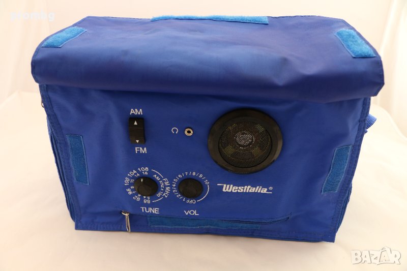 Хладилна чанта с радио, Westfalia- Германия, използвана, в отлично състояние. Хладилна чанта с вградено радио-обхват FM и АМ / средни вълни/, изход за слушалки с жак 3,5 мм. Презрамка за носене на рамо. Размери: Ш / Д / В : 32 см / 23 см / 20 см. Водоустойчива материя. Работи с 4 AA батерии (не са включени).
