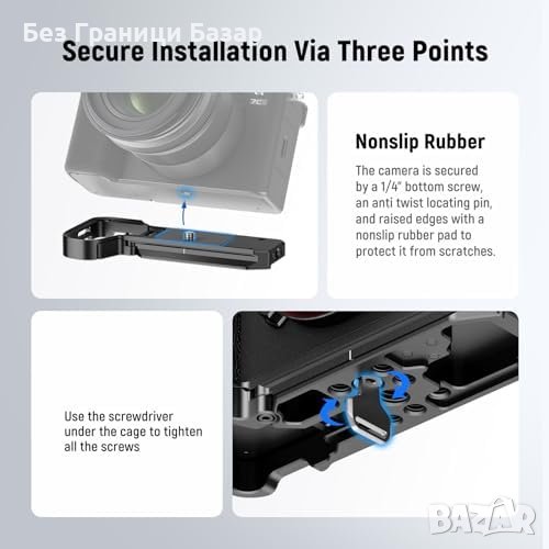Защита на Камерата: Обезопасена с 1/4" винт, пин за анти-завъртане и гумена подложка.