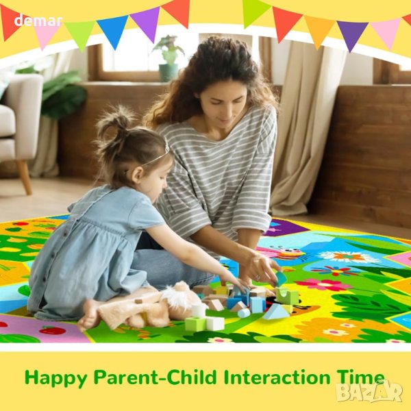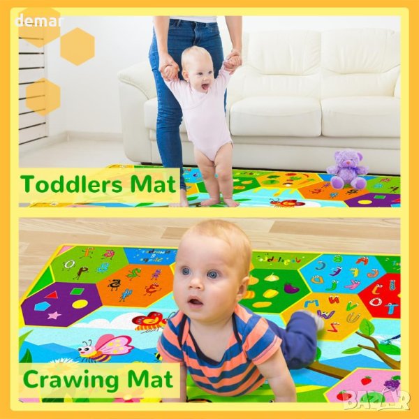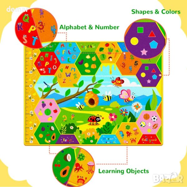 Жива постелка за бебета, включваща увлекателен дизайн на тема пчели с букви, цифри и предмети за интерактивно обучение. Тази голяма и мека зона за игра е с размери 2х1,5 метра, осигуряваща безопасно и удобно пространство за вашето бебе да играе, пълзи и изследва. Изработена от висококачествена, нетоксична материя с противоплъзгащи се частици, тя осигурява сигурна и неплъзгаща се повърхност. Почистването е лесно с нейната лесна за избърсване или машинно пране повърхност. Освен това е преносима и удобна за пътуване, побира се в раница или куфар за семейства в движение. Кажете здравей на щастливото и активно време за игра с тази постелка!