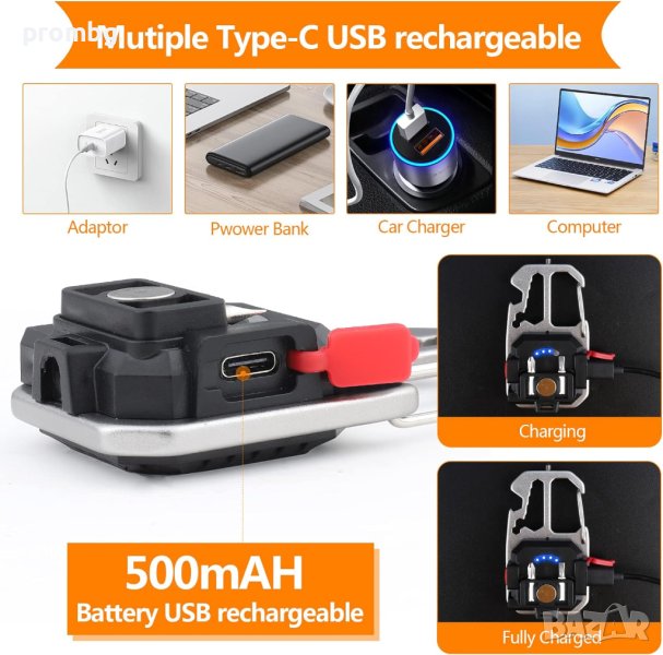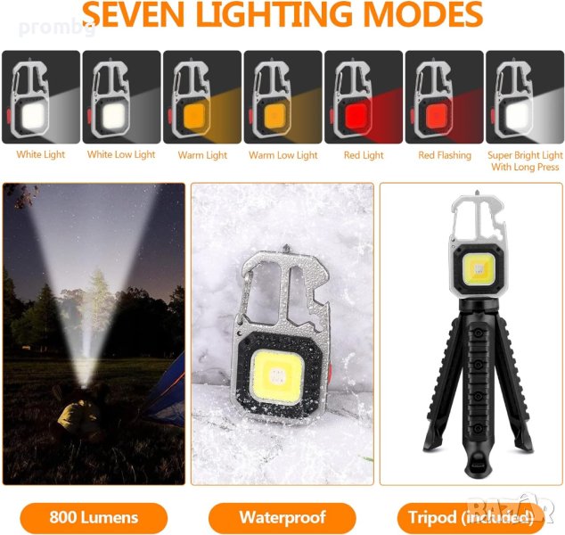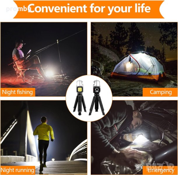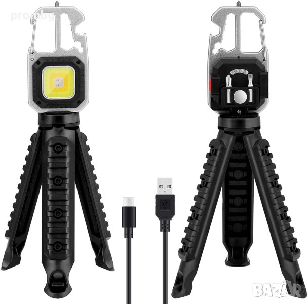 многофункционална LED лампа, фенер 800 lm, внос от Германия. Подходящо за къмпинг, риболов, ремонтни дейности, излет и др. Акумулаторно LED фенерче с 3 светлинни цвята: бяла светлина, топла бяла светлина, червена светлина. Водоустойчиво, включен статив (трипод), карабина за закачане, силен магнит, отварачка за бутилка, накрайник за чупене на стъкло, права и кръстата отвертка.