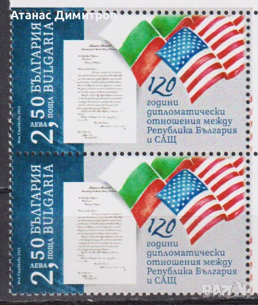 2. Чиста марка (x 2) Дипломатически отношения със САЩ 2023 от България. тираж 6000 марки цена 7.50 лева (сн. 2 и сн. 3)