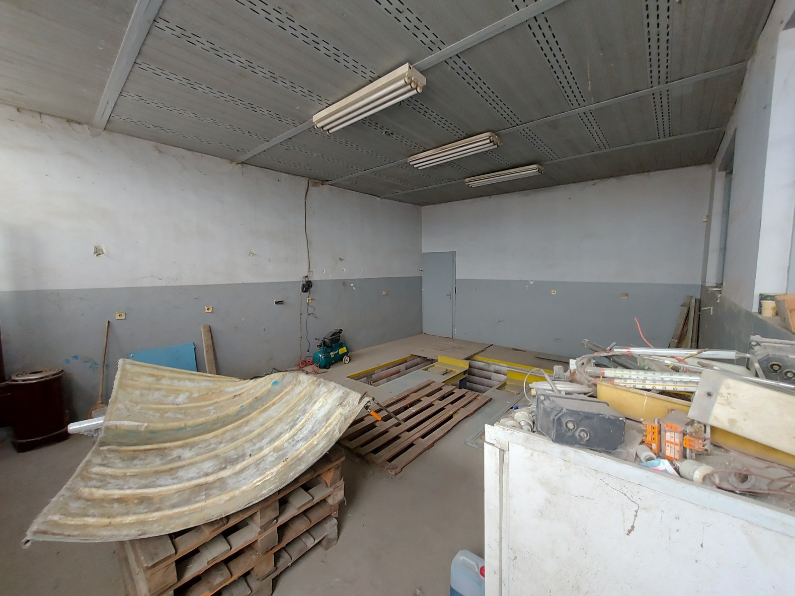 2. УПИ с площ 381кв.м. със ситуирано в него хале монолитна конструкция с метален покрив с площ 381кв.м. (ориентировъчни размери 16м/25м.) Височина било - 10м. Имота разполага с всички комуникации, трифазен ток, като в непосредствена близост е трафопоста, права вода и канализация! Три портални индустриални врати, като едната е с достъп на високи камиони. Изградена административна част на 2 етажа по 60кв.м. Големи канали за авторемонтни дейности. Отделено помещение с достъп от едната врата. Частично минимално ДДС. Цената е сформирана по следния начин: