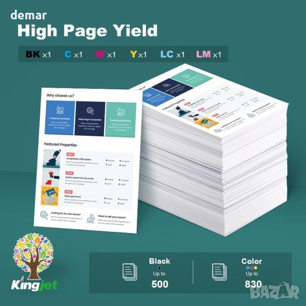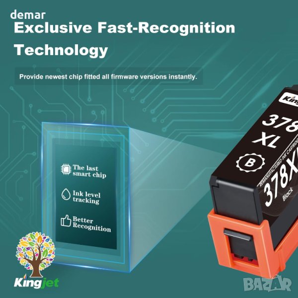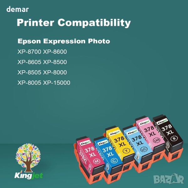 KINGJET 378XL Remanufactured Ink Cartridge Multipack е проектирана за безпроблемна съвместимост с редица принтери Epson Expression Photo, включително моделите XP-8700, XP-8600, XP-8605, XP-8500, XP-8505, XP-8000 и XP- 8005. Снабдени с най-новите подобрени чипове, тези касети осигуряват перфектна съвместимост с маркови принтери, осигурявайки живи цветове и ясни, гладки разпечатки както за снимки, така и за документи, благодарение на висококачественото си мастило на базата на багрила. С дизайн с голям капацитет, черната касета 378XL дава приблизително 500 страници, а всяка цветна касета 378XL предлага около 830 страници при 5% покритие на хартия A4, осигурявайки рентабилни решения за печат. Опаковката включва общо 6 касети (1 черна, 1 циан, 1 магента, 1 жълта, 1 светло циан и 1 светло магента), всяка с голям обем мастило (16 ml за черно и 11 ml за всеки цвят), гарантиращо дълготрайност дълготрайна употреба и по-малко смени, всички придружени от ръководство за лесен монтаж.