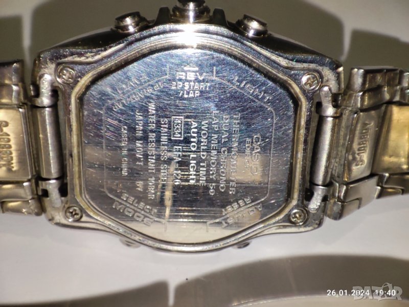 Продавам ръчен часовник Casio edifice. 12/24 часов формат, хронометър, термометър, звуков сигнал на всеки кръгъл час. Световно време. Електролуминисцентно осветление на целия дисплей, заден капак с винтове, водоустойчив. Две батерии за по-дълго издържане около две, три години от смяна до смяна.