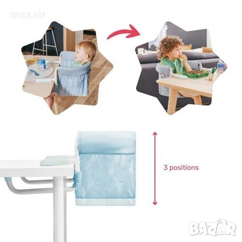 Компактен, лек и лесен за използване стол, който се захваща за масата. Настанете бебето удобно в дълбоката, обгръщаща седалка с 3-точков колан. Лесно се поставя и се фиксира здраво върху масата със система за закрепване с 4 рамена, която пасва на повечето маси (от 20 мм до 53 мм максимум). За повече комфорт на детето, може да се регулира на 3 различни височини. Столчето за хранене Badabulle е практично решение за хранене у дома или навън. Сгъва се и се разгъва лесно, така че можете да го носите навсякъде със себе си: когато пътувате, хапвате в ресторант или посещавате приятели или роднини.