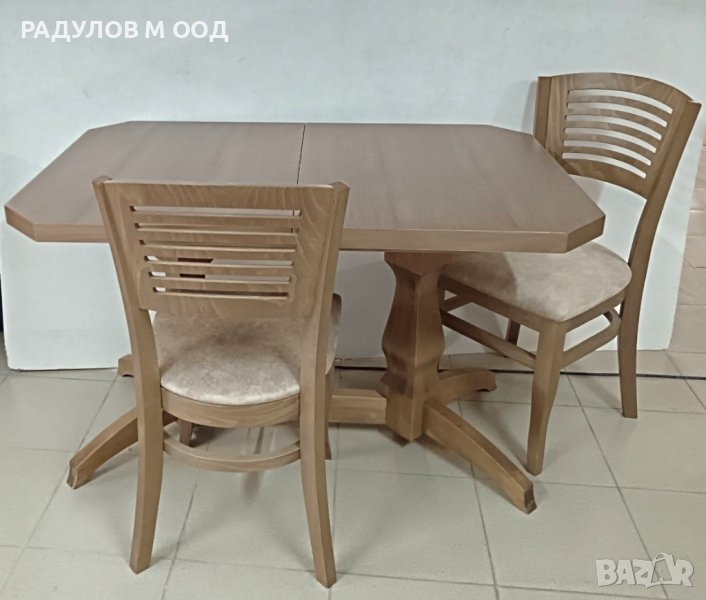 Трапезна маса “Никол“ е изработена от качествена букова дървесина. Плотът е с естествен фурнир. Конструкцията е здрава. Окомплектована е със съвременни механизми и обков.
