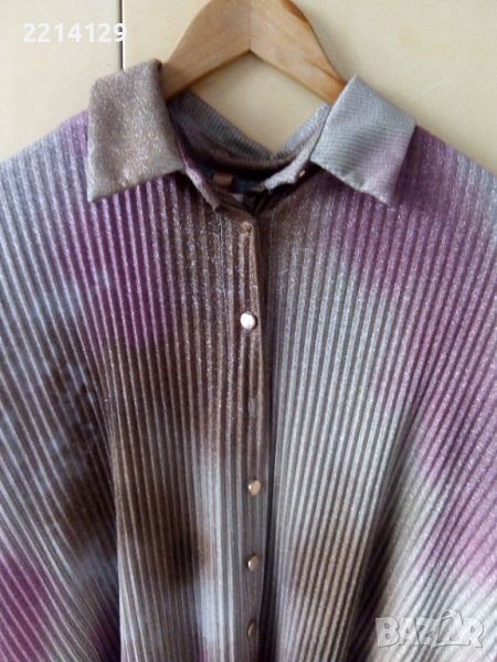 Продавам широка дамска риза с различна дължина отпред и отзад. Състав - 100% полиестер. Произведена в Италия. Размери - рамене - 58 см, талия - 82 см, дължина - 80 см отпред и 106 см отзад, дължина на ръкава - 58 см. Нова.