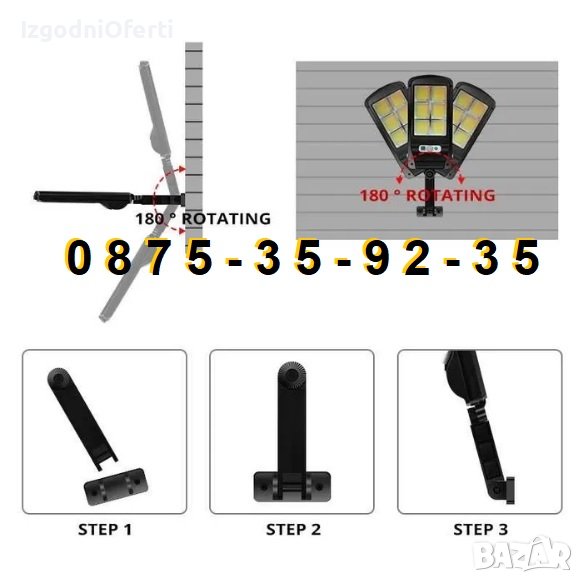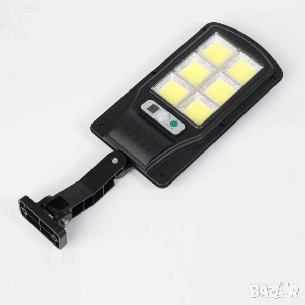 Лампата е с вградени мощни COB светодиоди. Има 6 COB панела със общо 120COB диоди. Осветява безпроблемно Вашата градина, барбекю, тераса и други. Зарежда се чрез вграден соларен панел през деня и работи през нощта. В комплекта има включена стойка за монтаж с двупосочно регулиране на ъгъла и позицията.