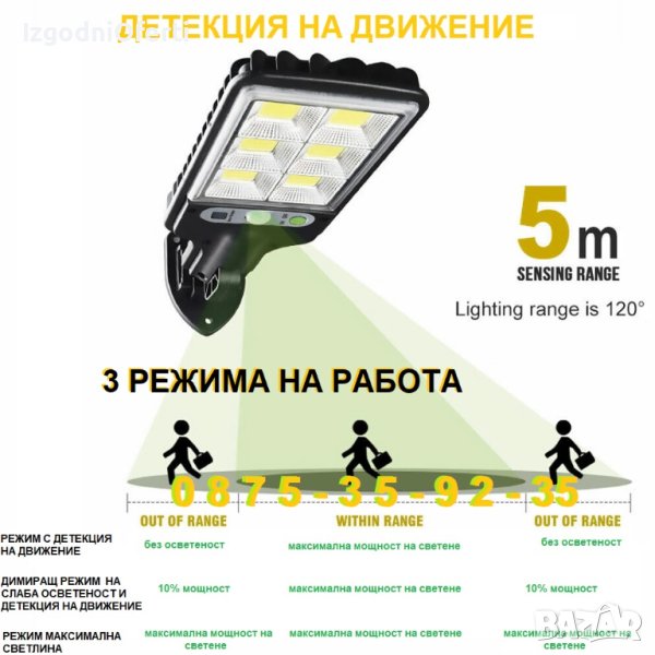 - РЕЖИМ 1: Когато засече движение светва ярко за 30 секунди и се изклюва