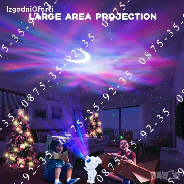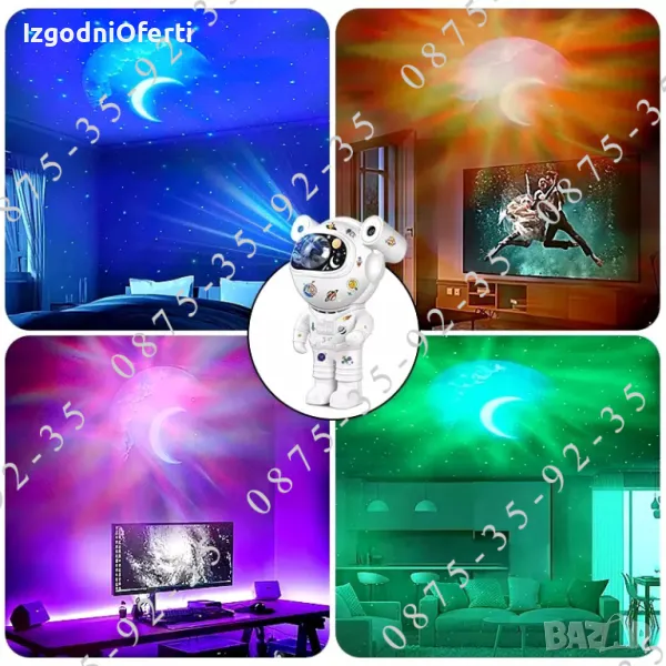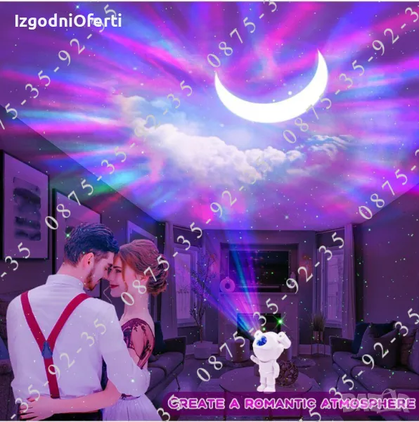 Най-новият модел Galaxy Star проектор. ПОСЛЕДНА МОДИФИКАЦИЯ НА МОДЕЛА - 2024 г. Главата му разполага с 3 броя прожекционни лампи, който проектират Звездно небе (ЗВЕЗДИ), ЛУНА, разноцветни ГАЛАКТИЧЕСКИ ИЗОБРАЖЕНИЯ, които може да активирате индивидуално или в комбинация. Може да настроите общо 84 комбинации от светлинни ефекти. Астронавтът разполага с дистанционно управлени и с контролен панел на главата, като всички функции и ефекти може да се управляват и от двете места. Tози галактически проектор трансформира всяка стая в галактика, боядисва стени и тавани по ваш избор с невероятни космически гледки. Забравете остарелите лед ленти и светещи окачени тавани - с този проектор с лекота преобразявата дома си. Висококачествени и детайлни изображения красят интериора с натискане на един бутон. Може да регулирате вида на космическия шаблон, луната, звездите, яркостта и скоростта на въртене, за да персонализирате прожекционния ефект, който харесвате. Моделите на звезди или мъглявини могат да се използват едновременно или поотделно. Освен това можете да настроите таймера на 30, 60 или 120 минути, като в този случай светодиодният звезден проектор за нощна светлина ще се изключи автоматично, когато заспите под звездно небе.