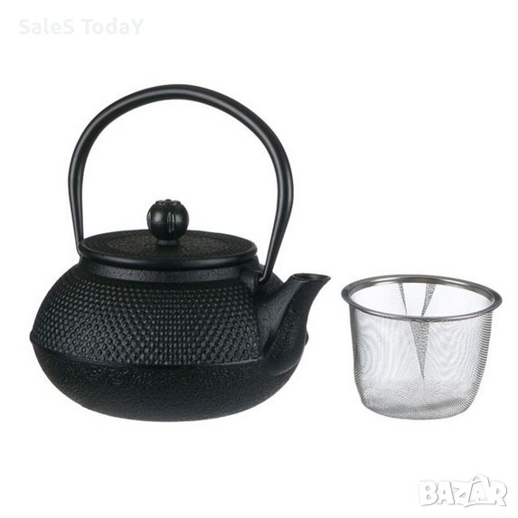 Чугунен чайник с релефен дизайн на точки и заоблена дръжка. Налейте гореща вода в чайника и поставете чая или друга напитка в металния филтър. Оставете за 3-5 минути и сервирайте.