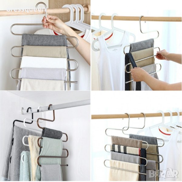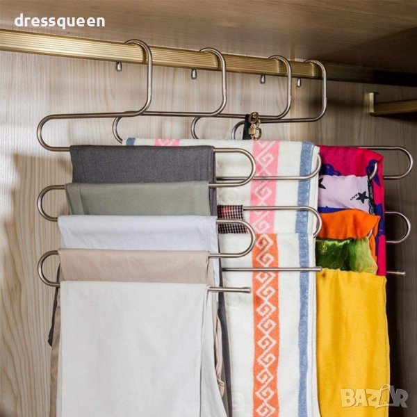 S-образна закачалка за поли, панталони, вратовръзки, кърпи и други. С тази закачалка органайзер ще спестите място в гардероба и дрехите, подредени на нея няма да се измачкат. Побира няколко чифта наведнъж.