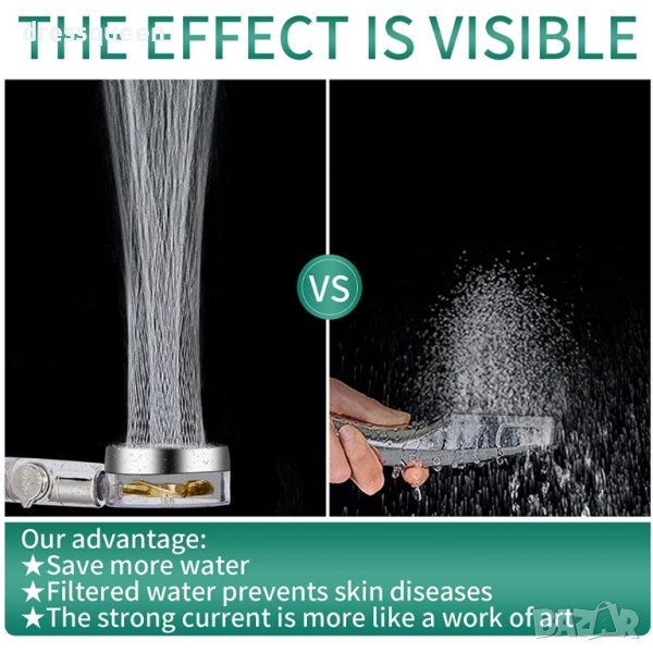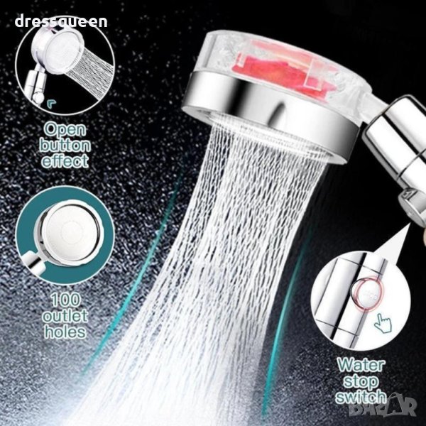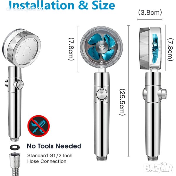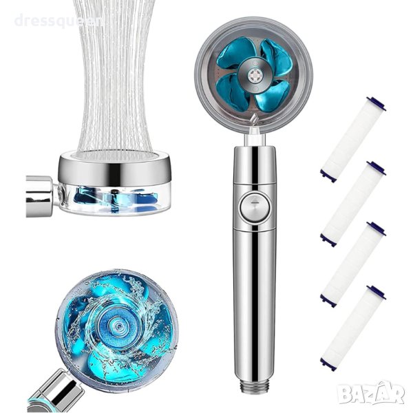Иновативна душ слушалка с вградена перка за турбо ефект, който увеличава струята и налягането на струята на водата. 3D перката създава хидромасажен ефект. Лесно променяне на желания ъгъл, 360 градуса на въртене и 60 градуса на наклон на душа. Изработката е от висок клас хром покритие, устойчиво на корозия или високи температури. SPA ефект е другата допълнителна опция на душа, има фини решетки, които разпръсват равномерно водата и спестява между 30-40% вода.
