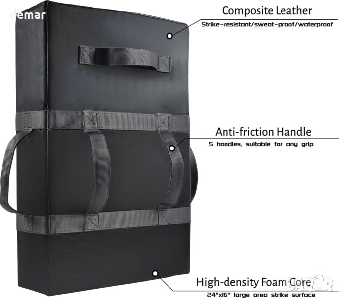 Висококачествена блокираща подложка, изработена от синтетична кожа за издръжливост и надеждност. Проектирана за тренировки по бойни изкуства, тя разполага с пяна с висока плътност за превъзходна защита и дълготрайно представяне. С пет множество каишки, тя подобрява функционалността на щита и позволява практикуване от различни ъгли. Тази многофункционална подложка за спортни тренировки е универсална, подходяща за тренировки по футбол, баскетбол и лакрос, което я прави основен инструмент за спортисти от всички нива.