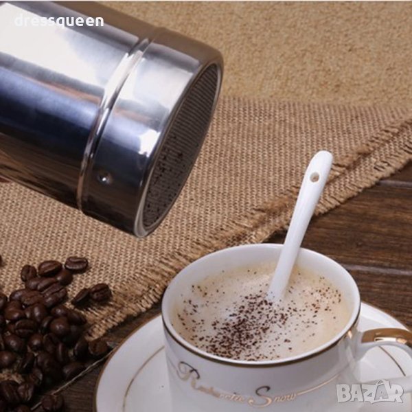 Удобно малко сито за поръсване с пудра захар на сладкиши, мекици и др. Може да се използва с какао, кафе, канела и други подправки.
