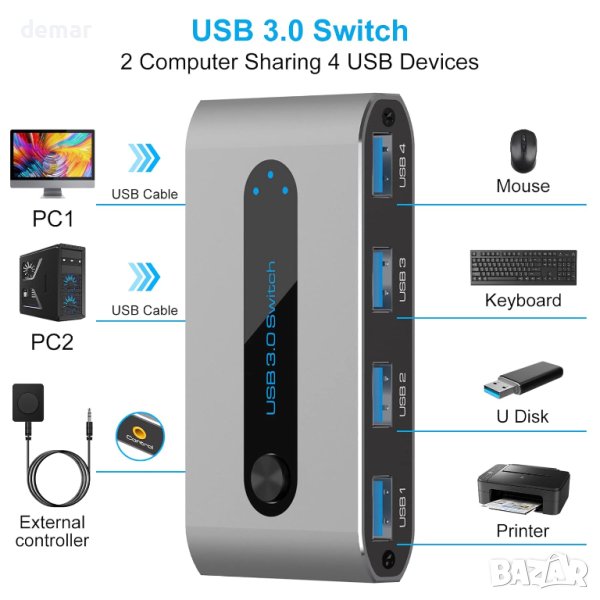 USB 3.0 превключвателят позволява на два компютъра да споделят четири USB 3.0 периферни устройства като принтери, скенери, клавиатури и USB твърди дискове. Предлага превключване с един бутон за удобна работа, както на шасито, така и с бутон за управление с кабел. Със скорост на трансфер на данни до 5Gbps, той е идеален за USB 3.0 устройства с висока честотна лента и е обратно съвместим с USB 2.0. Превключвателят разполага с отделен Micro USB порт за захранване, осигуряващ съвместимост с USB устройства с висока мощност. Той е широко съвместим с различни операционни системи и не изисква драйвери, което го прави универсално и ефективно решение за вашето работно пространство.
