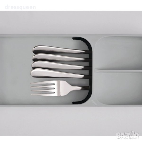 Компактен органайзер за прибори има изчистен дизайн в правоъгълна стеснена форма, разграфена на четири отделения за всички прибори - три големи и едно по-малко. По-малките са идеални за чаени лъжички и вилички.