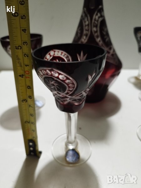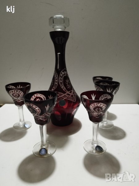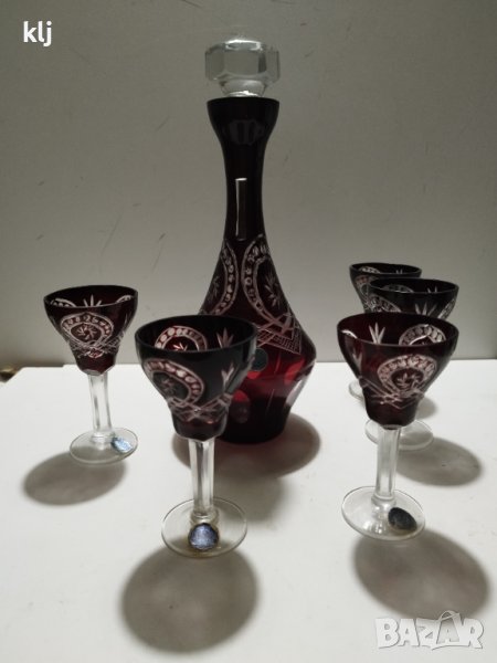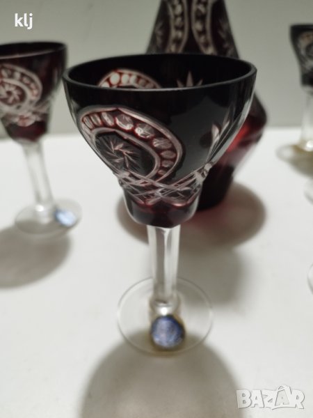 Кристални чаши с гарафа цветен червен кристал ръчно гравирани рубинено червен кристал сервиз комплект сет лот ретро арт декор винтидж колекция стари стъкло цветно стъкло ракия аперитив маса гости стъкло кристал чаши чашки цветно стъкло дом празник, чашите са 5 броя