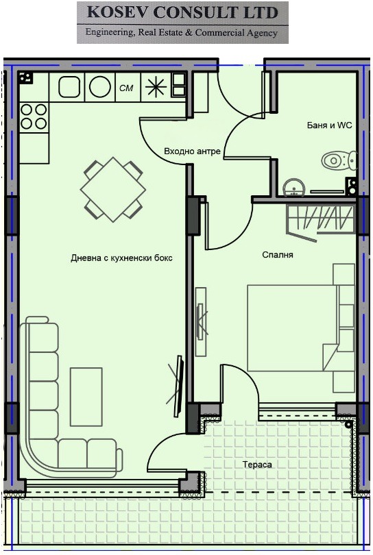 Апартаментът се състои от хол с бокс, спалня, баня и тоалетна заедно, входно антре и просторна тераса.