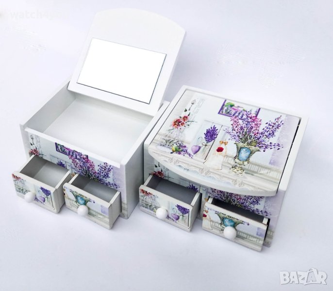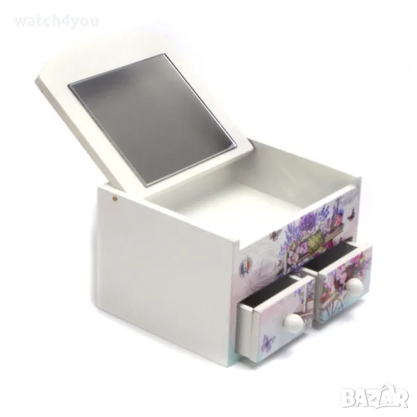 Кутията е с огледало на капака, едно отделение и две чекмеджета.