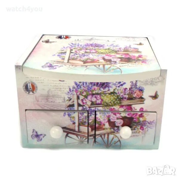 Стилна дървена кутия за бижута, декорирана с цветя.