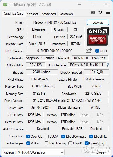 Видеокарта: Sapphire RX470, 8GB.
