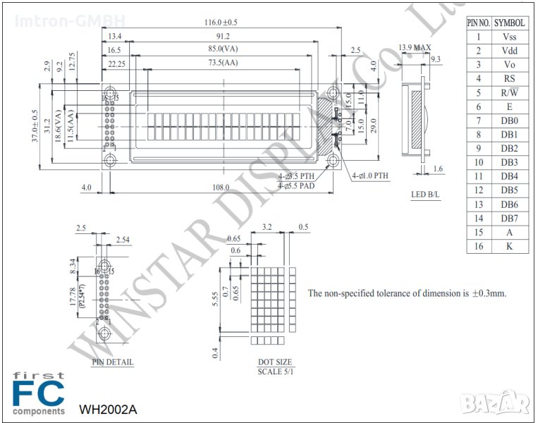 WH2002A е символен LCD 20x2 дисплей, който е вграден с контролер ST7066 IC; неговият интерфейс по подразбиране е 6800 4/8-битов паралелен.