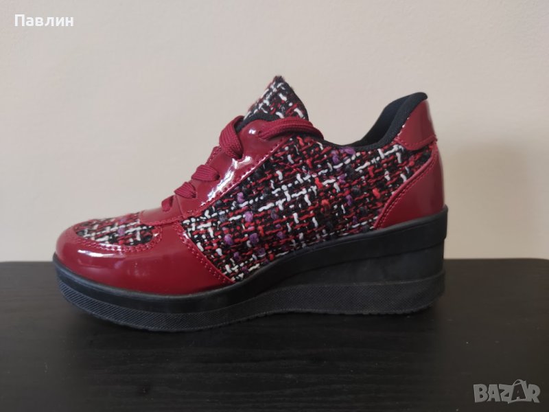 Дамски спортни обувки на платформа, лак бордо и текстил