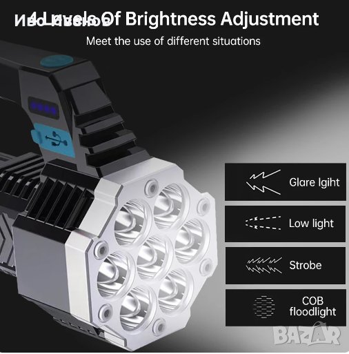 индикатор за акумолаторното захранване. Фенерът има 5 функции (режими на светене): 100%, 50%, страничен