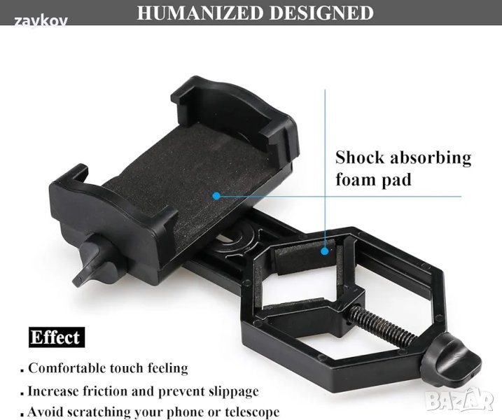 Удобен дизайн: повърхността на мобилния телефон и окуляра са покрити с мек EVA материал. Това предотвратява надраскване или повреда и гарантира стабилност. Стативът може да се прикрепи към винтовата връзка на телефонния адаптер.