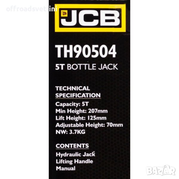 Хидравличен крик JCB TH90504 е предназначен за товари с тегло до 5т. Максималният ход на буталото е 125 мм, а на винта 70 мм. Предназначен е за вертикални подемни операции. Максималната му височина е 402 мм, а минималната 207 мм.