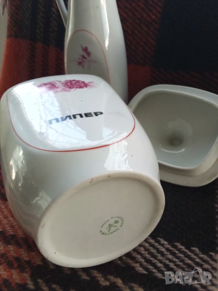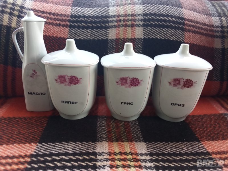 Буркани за съхранение на продукти,здрави като нови .има големи и малки и един оливник.Имам и една солница ,3 малки бурканчета с капак, но без картинка и един оливерник от различен сервиз.Едно от капачетата на малките бурканчета без картинка е с отчупено парченце на долния ръб,но парченцето е запазено.