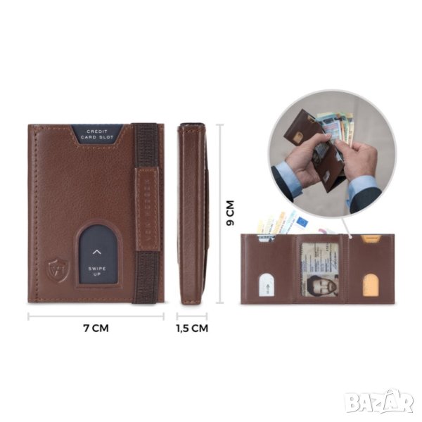 Отделението за банкноти, с подплата в нюанси на тъмно синьо, позволява съхранение на едри банкноти без лице. Превъзходното качество на шевовете и покритията подчертават елегантния и семпъл дизайн на портфейла. Всеки портфейл се доставя във висококачествена опаковка, със семпъл и минималистичен дизайн - перфектният подарък за вашите близки!