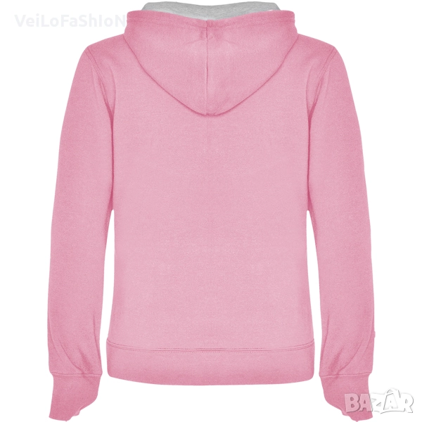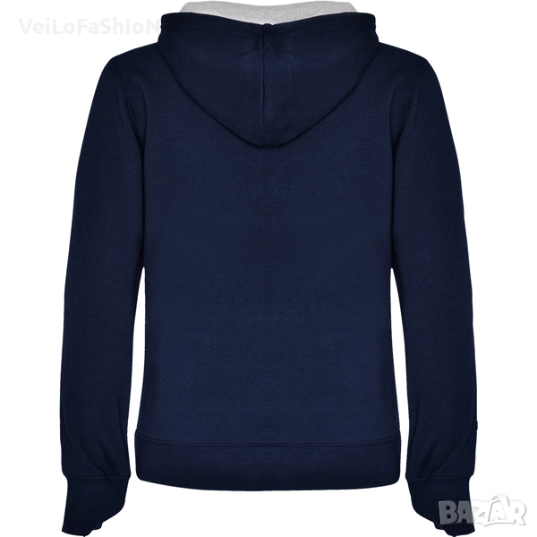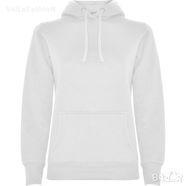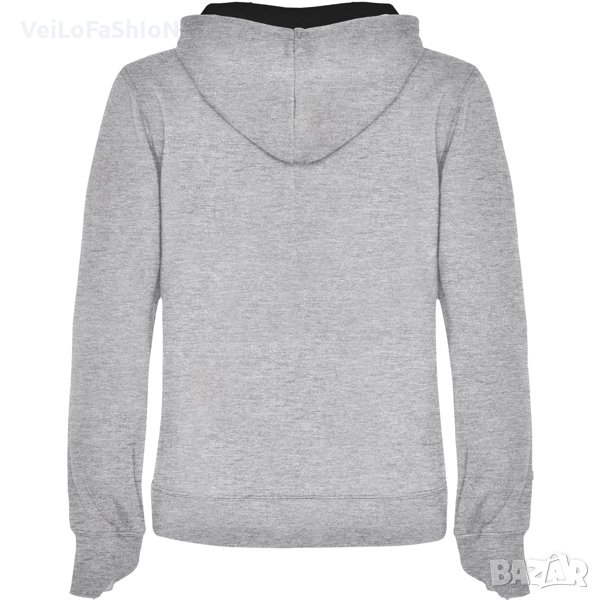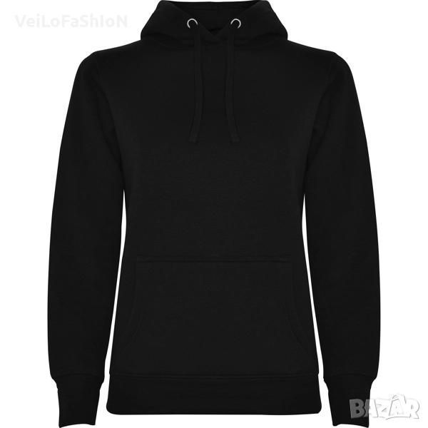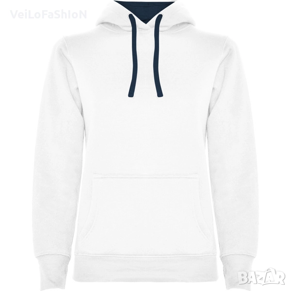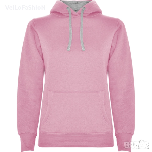 Нов дамски суичър с джоб отпред тип "кенгуру" и двойна качулка с контрастна подплата и връзка в различни цветове. Произведен от 35% памук, 65% полиестер с плътност 280гр./м². Много добра комбинация на памук и полиестер, която от една страна не позволява избеляване и ставане на топчета(пилинг), от друга прави материята по дебела, пухкава и мека на допир. Суичъра е с ластични маншети на ръкавите и кръста, които запазват топлината. Подходящ както за ежедневна употреба, така и за спорт или тренировка в свободното време
