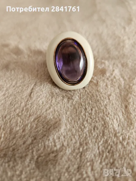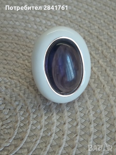 Изключителен сребърен пръстен с лилав камък, бял емайл и позлата. Уникат. Размер на халката 18мм, размер на лицевата част 35/28 мм, тежи 18,04 грама. В отлично състояние, без забележки по емайла, камъка и позлатата. С маркировка 925 и житен клас.