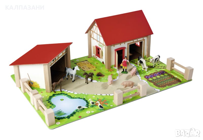В комплекта са включени 20 елемента, включително фигурки на фермерка и на различни животни: гъски, крави, прасета и коне.