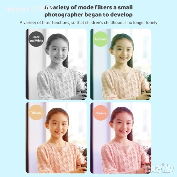 Поддържа USB зареждане, което е удобно и бързо. Паметта на камерата поддържа заснемането на 30 снимки и поддържа до 64GB карта с памет. Цифровата видеокамера е оборудвана с 6 филтърни ефекта, добавяйки фантастични магически ефекти към детските творения и обогатявайки детството на вашето дете.
