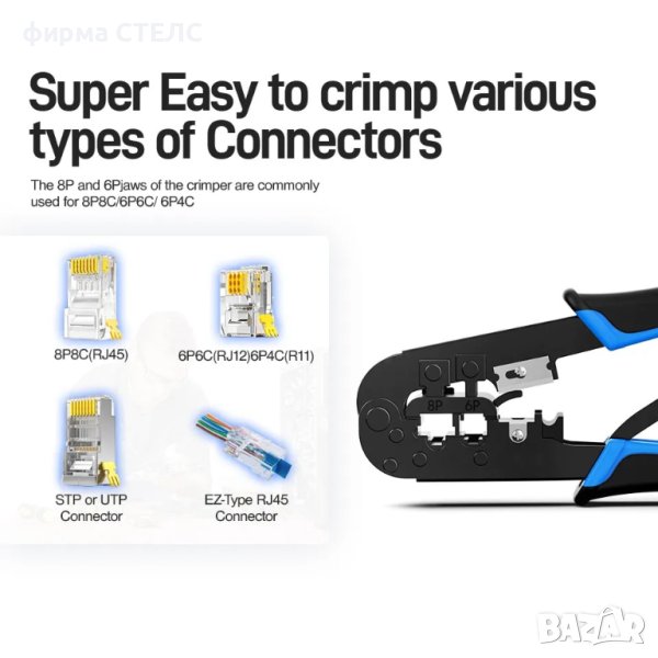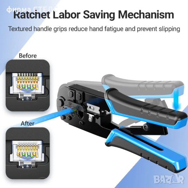 Този инструмент може да кримпва кабели RJ11, RJ45 и RJ12, което го прави универсално решение за всички ваши нужди за кримпване на кабели. Клещите са специално проектиран за Ethernet мрежи, което го прави основен инструмент за мрежови администратори и техници.