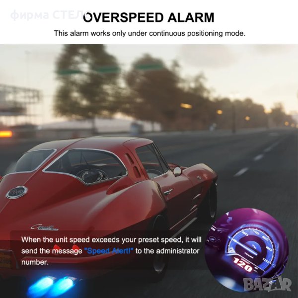 Тази аларма работи само в режим на непрекъснато позициониране. Когато скоростта на единицата, която сте задали предварително, тя ще изпраща съобщение "аларма за скорост!" до администраторския номер на всеки 5 минути.