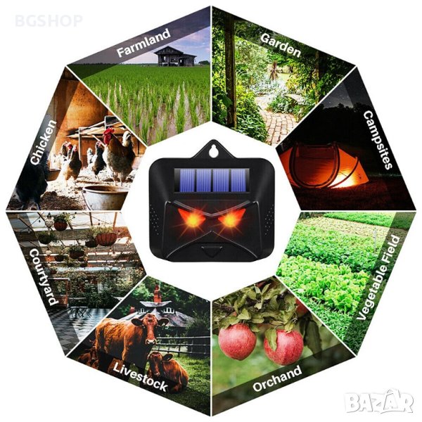 Прогонете нежеланите животни от своята градина и двор с новия соларен ултразвуков уред с фотоклетка. Той ще отблъсне животните като: котки, кучета, птици, лисици, мечки, елени, гризачи и влечуги.