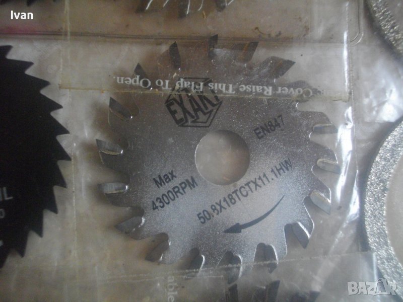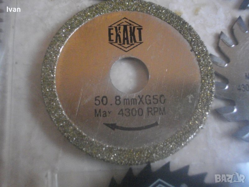 Марка на дисковете ф 50,8 мм - EXACT.Немски. 3 вида. Диамантинеи - размери точен - ф 50,8 х G50 x 11 mm. Налични 8 бр. Дискове за дърво с видирани зъби 18 броя зъби - налични 7 бр. дискове. Размери точни - 50,8 х 18TCT x 11,1. Дискове за дърво черни с прави зъби - налични 4 бр. Размер ф 50,8 мм х 44 х 11,1 мм. Всички дискове са съвсем нови, неизползвани и неупотребявани.