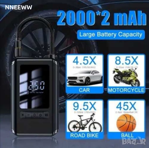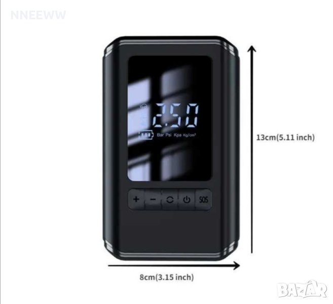 компресор за гуми с фенер.Изключително здрав удароустойчив пластмасов корпус.Предназначен основно за напомпване на автомобилни и велосипедни гуми.4 режима на работаРаботно напрежение: 12V.Мощност: 60 WНоминален ток: 8АМаксимално работно налягане: 130 PSLВъздушен поток: 30 литра / мин.Максимална работна температура от: -20 до 60°C.С включени накрайника за помпане, въздушен маркуч, кабел за зареждане Type-C.Описание:Акумулаторен авариен компресор за гуми, изработен от висококачествени и здрави материали с цифров дисплей.Компресора има цифров дисплей, както и бутон за смяна на различни мерни единици (bar, Kpa, psi, Kg/cm 2). Той автоматично ще се изключи при достигане на предварително зададената от вас стойност на налягането. Отнема по-малко време и усилия от крачна помпа.Това е един наистина необходим аксесоар в колата при нужда от корекции на налягането на гумите на пътя. Също така е идеален за къмпинг или на плажа, за да надуете надуваем дюшек, топки или други надуваеми играчки за децата.Компресора е малък, компактен, лесен за пренасяне и за използване, удобен и безопасен.Не използвайте компресора за помпене на гуми с високо налягане, като: камиони, бусове и др.