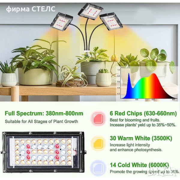 Пълен спектър- Подпомага растежа на растенията и допринася за синтеза на хлорофил.