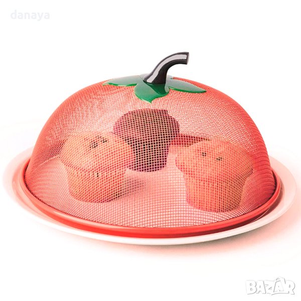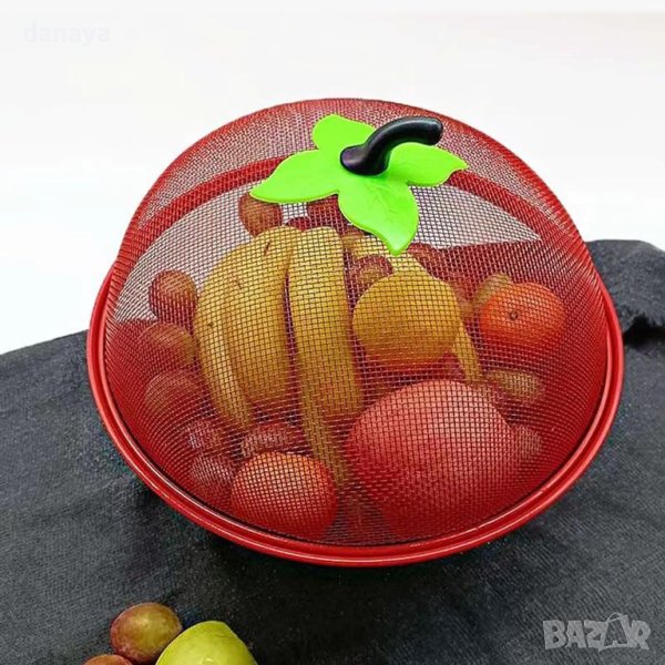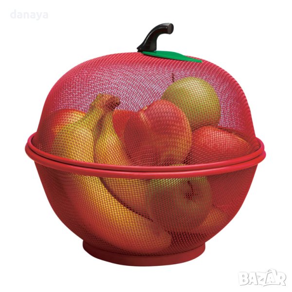 Метална купа панер ябълка. Мрежест панер с капак за съхранение на плодове и зеленчуци. Метална купа за плодове с нестандартна форма на ябълка. Благодарение на капакът, купата идеално предпазва продуктите в нея от всякакви насекоми през лятото. Панерите се предлагат в цвят червен.