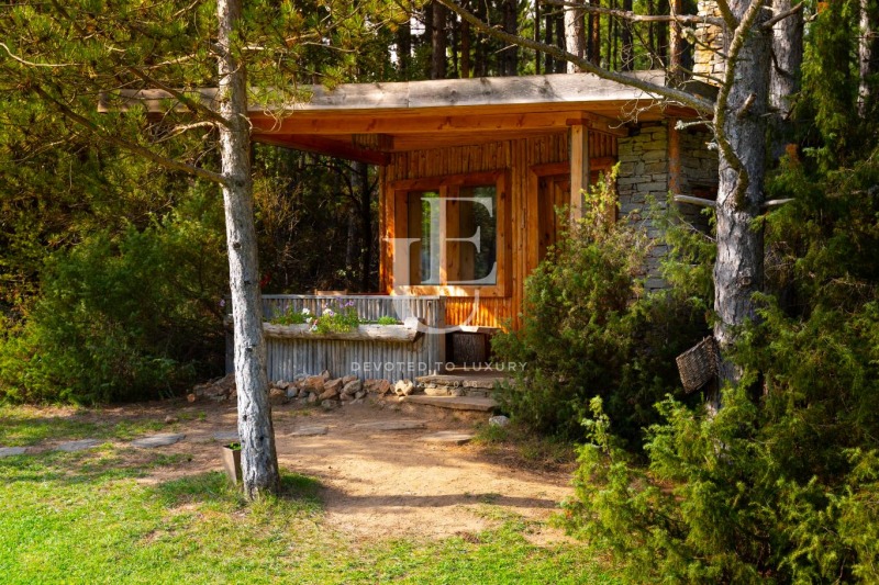 Горската къща: Обзаведена е комфортно, с две отделни легла, камина, малка кухня, трапезарна маса, баня с тоалетна и много горски дух и настроение! Лесно достъпна, потънала в горски цветя, в близост до открития басейн и всички активности на селището. Обща площ - 40m?