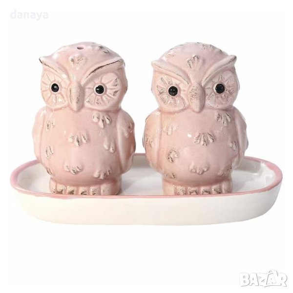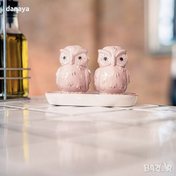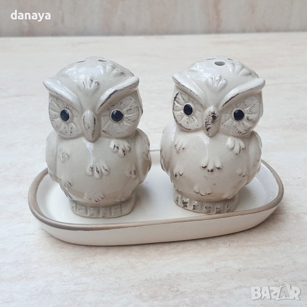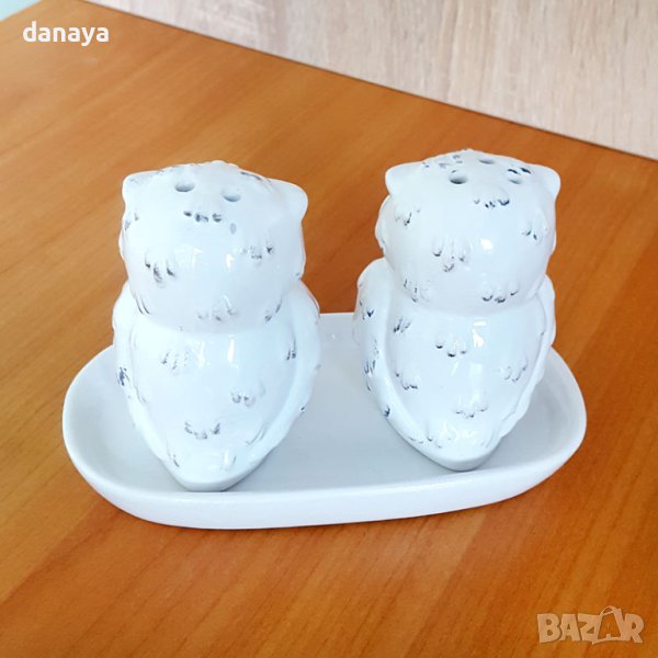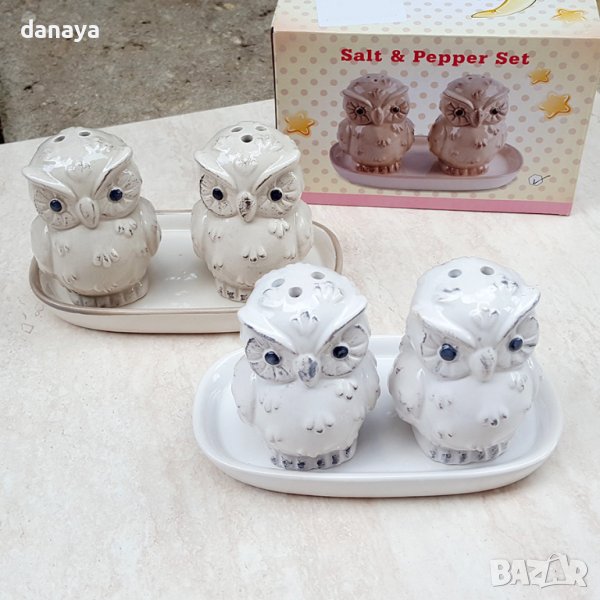 Комплект солница и пиперница с поставка с форма на малки бухалчета. Красив акцент във вашия дом. Чудесна декорация за една красива маса. Един по-разчупен сет солнички с поставка, бурканчета за подправки, подходящи за подарък. Солничките се предлагат в кутия.