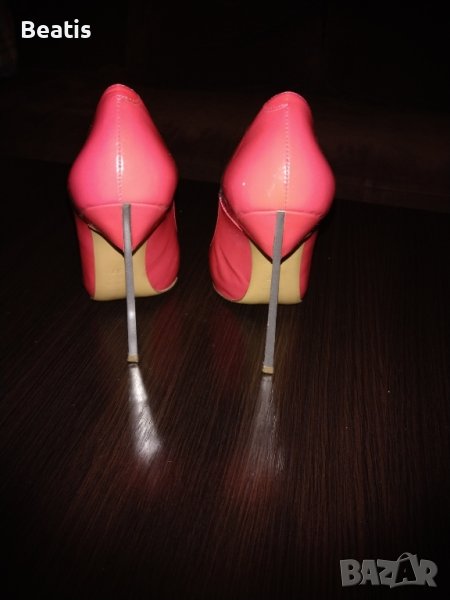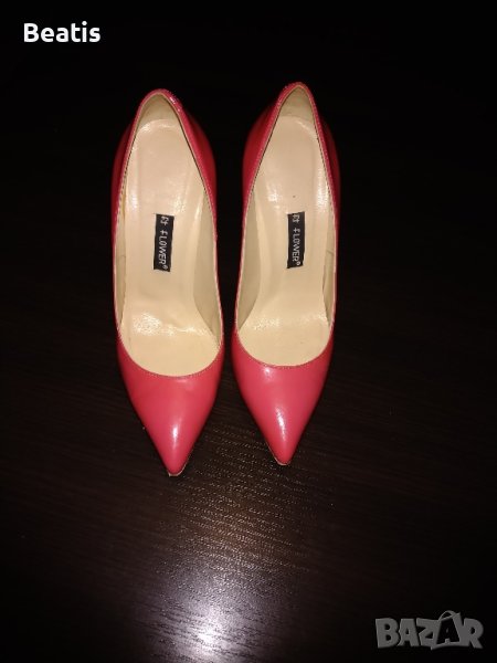 Бонбонено розови обувки на ток,37номер,обувани веднъж,марка flower,мисля че са естествен лак!