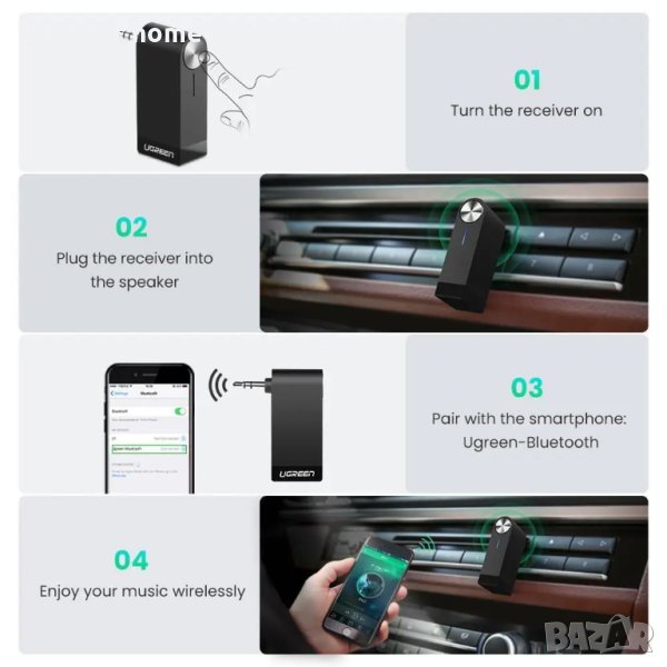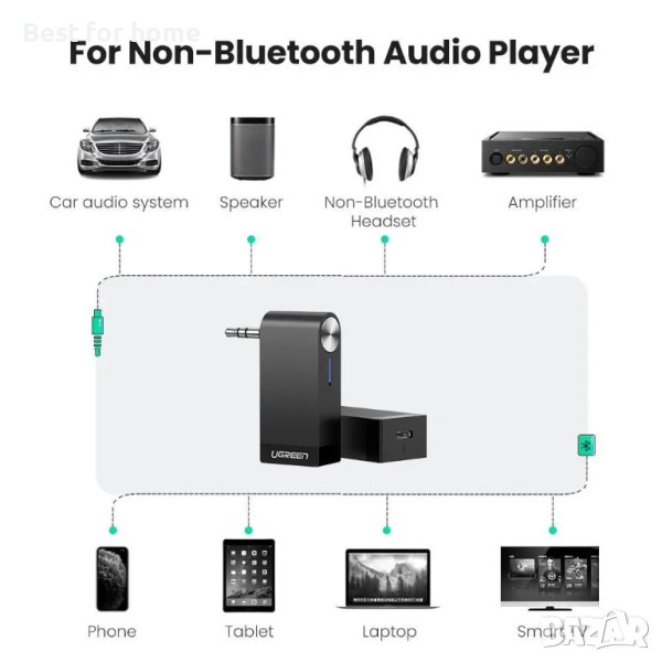 Аудио приемникът с микрофон е предназначен за приемане на музика от компютър, iPhone, iPad или MP3 плейър към стерео уредба в кола, домашен музикален център, високоговорителна система и други различни системи с 3,5 мм стерео изход. Този приемник превръща вашите обикновени високоговорители в безжични с Bluetooth. Използвайте вградения микрофон, за да говорите по телефона, докато шофирате.