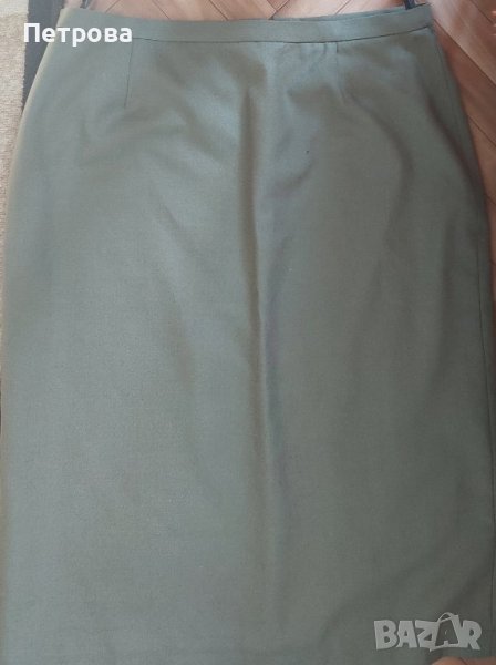 Дамски костюм, нов, вълнен. Стилно сако, размери по етикета 170-164-112, XXXL, в раменете 44 см, дължина на ръкавите 62 см, гръдна обиколка 112 см, дължина на сакото 62 см, приятен маслено зелен цвят, естествена материя. Цена 20 лв. Вълнена пола с подплата, нова, талия 92 см, ханш 120 см, дълж. 77 см. Цена 15 лв. При купуване на двете части - намаление - общо 30 лв. /15 евро/. Изпраща се с 10% отстъпка от общоприетата куриерска такса.